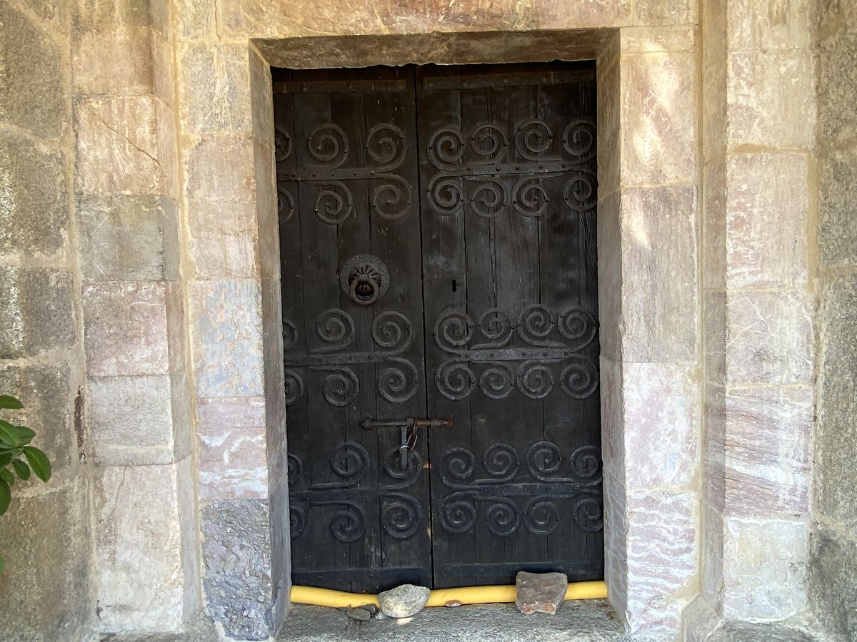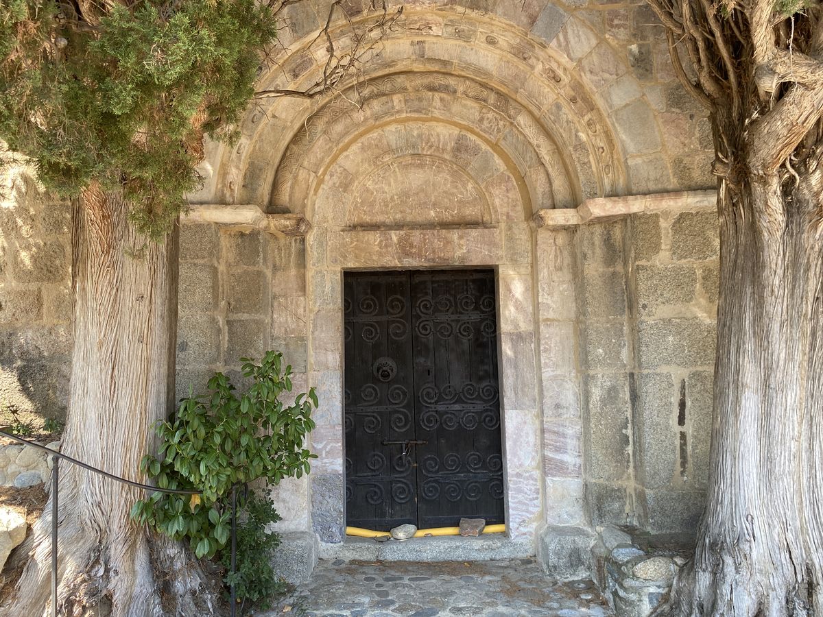 La façade méridionale est soutenue par de robustes contreforts et présente un portail du XIIIe siècle en marbre rose du Conflent. La porte en bois est ornée de pentures en fer forgé et encadrée de piédroits à impostes saillantes, supportant une archivolte richement décorée. La voussure externe porte des motifs de boules, de masques humains et de personnages fantastiques, tandis que la seconde voussure est ornée d’un motif de tresses.