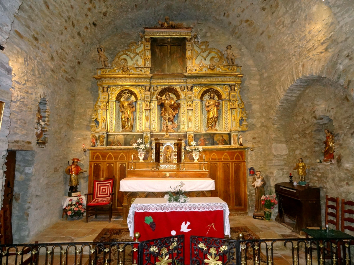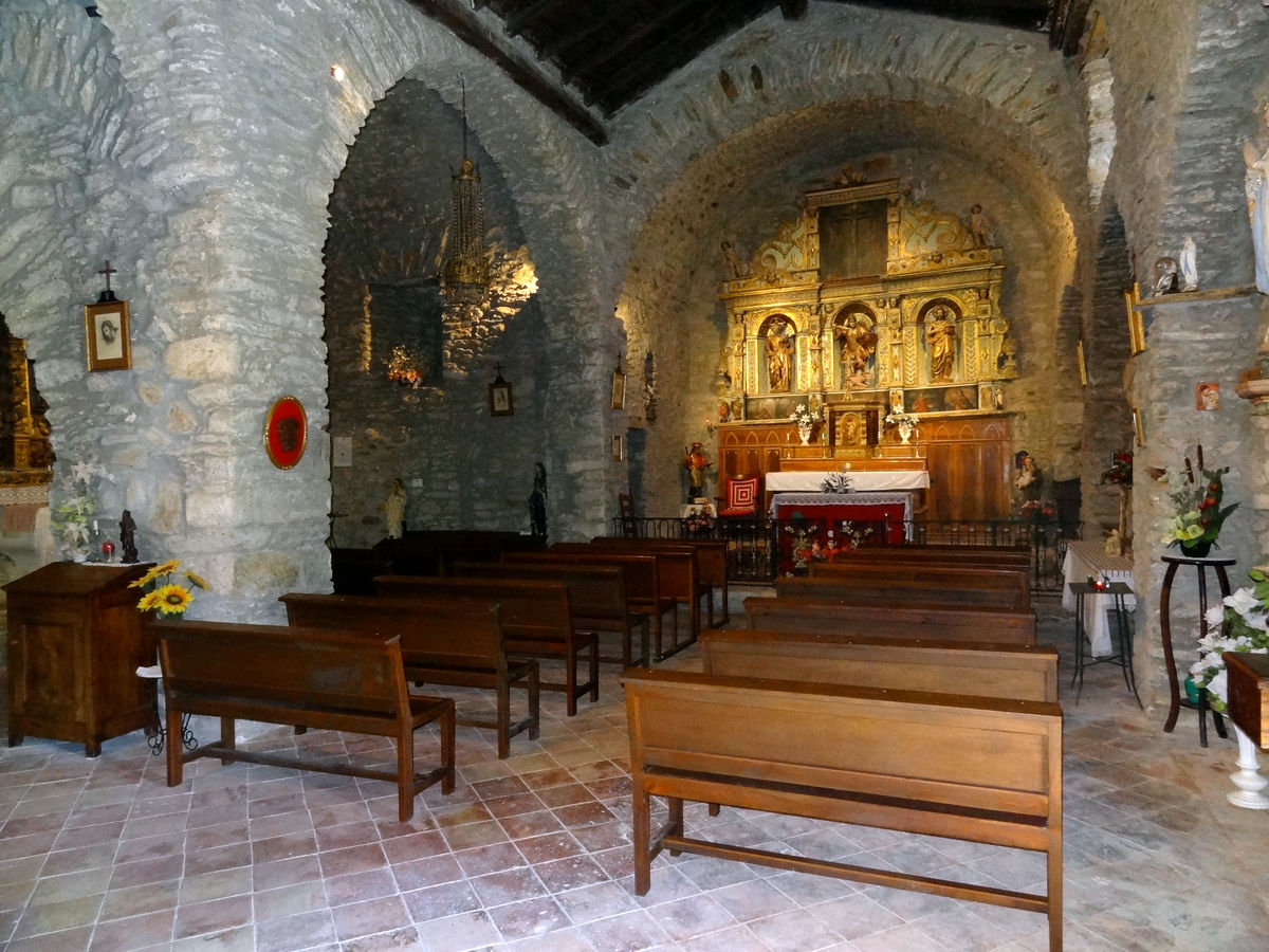 L’intérieur conserve plusieurs retables baroques, qui enrichissent son décor et contrastent avec la sobriété romane de la structure. Le retable du maître-autel se compose de 4 rangées. Les trois les plus basses, qui constituent le corps du retable, présentent toutes 5 casiers montrant des scènes religieuses variées.