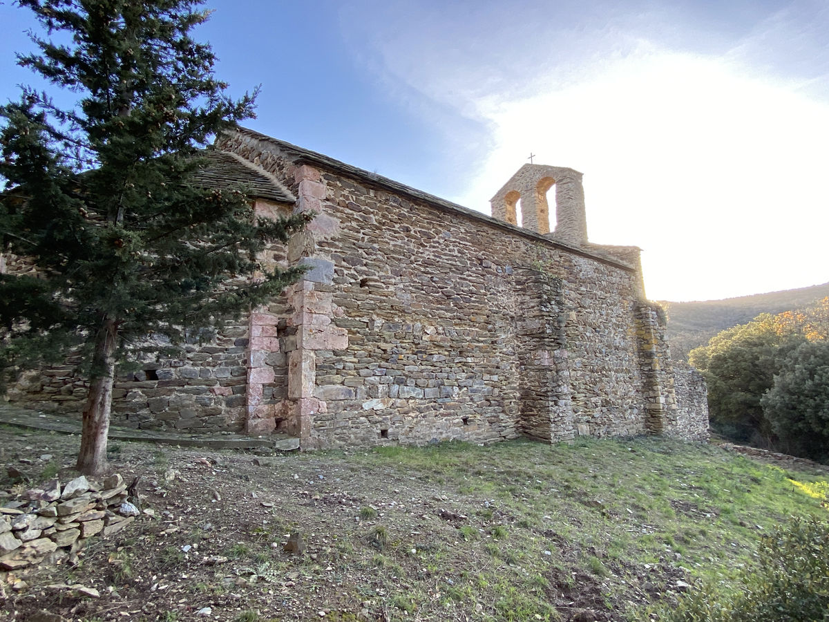 Mais parmi ces centres d’intérêt, cette chapelle est une vraie petite merveille. Parfaitement visible depuis Corbère-de-Dalt, au pied du château, elle se détache de la végétation en toute saison. En s’en approchant, on découvre un bel édifice que l’on suppose dater du XIIe siècle, ce qui s’avère exact. Cette église est évidemment d’origine romane et, comme toutes les églises romanes de la région, elle est faite de pierres locales. Initialement recouverte d’un toit en charpente, celui-ci fut remplacé aux XIIe et XIIIe siècles par des voûtes maçonnées. Il s’agit d’une chapelle à nef unique : longue de 16,20 m, de plan rectangulaire, elle est dotée d’un chœur en hémicycle, comme il était d’usage à l’époque. Le chœur est d’ailleurs séparé de la nef par un arc triomphal. Extérieurement, elle possède trois fenêtres : une sur la façade ouest, au-dessus du portail, une à l’opposé, au centre du chœur, et une troisième sur la face sud, plus tardive. Son clocher est un clocher-fronton à double arcade. Un clocher-tour existait probablement à l’origine : on en observe encore des traces sur le mur nord, mais celui-ci a disparu assez rapidement. Il devait sans doute servir de tour de surveillance, les églises étant souvent fortifiées à cette époque.