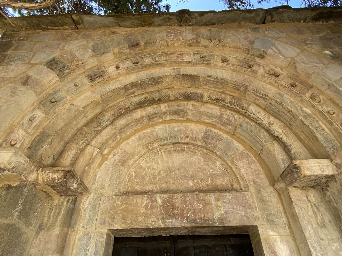 La façade méridionale est soutenue par de robustes contreforts et présente un portail du XIIIe siècle en marbre rose du Conflent. La porte en bois est ornée de pentures en fer forgé et encadrée de piédroits à impostes saillantes, supportant une archivolte richement décorée. La voussure externe porte des motifs de boules, de masques humains et de personnages fantastiques, tandis que la seconde voussure est ornée d’un motif de tresses.